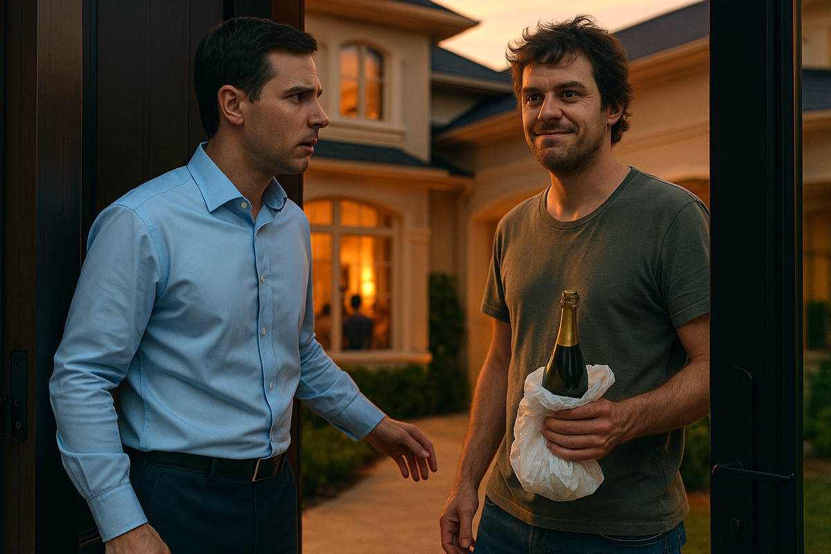 Когда он открыл дверь, на пороге стоял Тимур — его младший брат. Высокий, растрёпанный, в мятой футболке и с пластиковым пакетом, из которого торчала бутылка дешёвого шампанского. Его глаза блестели, речь была слегка заторможенной.