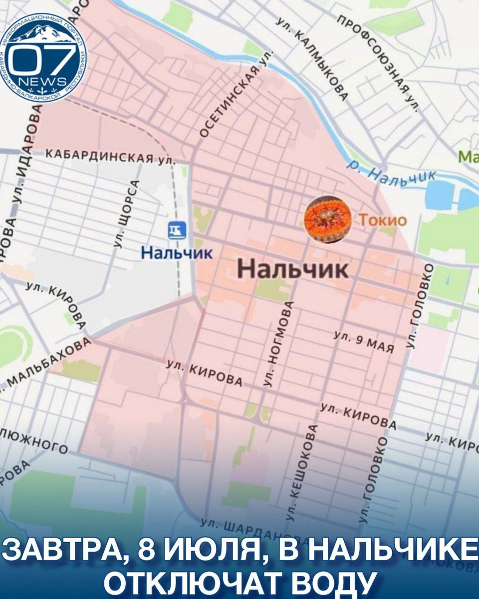 В Нальчике отключат воду 8 июля В связи с реконструкцией улиц Ногмова и Кешокова, 8 июля с 09:00 и до окончания работ в Нальчике будет отключено водоснабжение в районе, ограниченном улицами: 📍 Головко — Шарданова — Эльбрусская — Мальбахова — Осетинская — Кабардинская — Т. Идарова — пойма реки Нальчик — Кешокова — Головко. 💧Жителям рекомендуется заранее запастись водой.