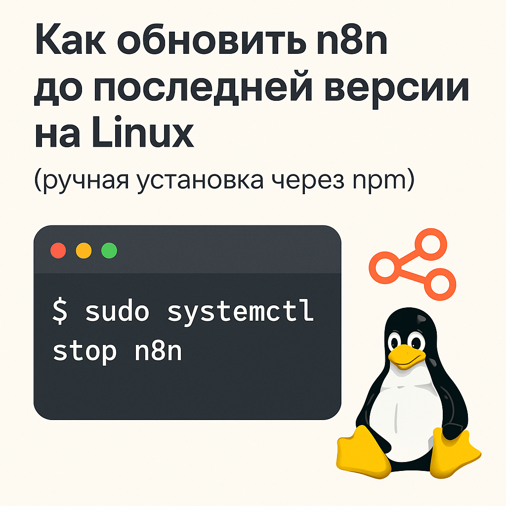 Если вы устанавливали n8n вручную через Node.js (nvm + npm) и запускаете его как systemd-сервис, эта пошаговая инструкция поможет вам обновить его до последней стабильной версии. Всё делается за 5 минут! sudo systemctl stop n8n Если используете nvm — убедитесь, что активна актуальная версия Node.js (18.x или 20.x): nvm use node Затем установите последнюю версию n8n: npm install -g n8n ⚠️ Во время установки могут появиться предупреждения вродеnpm WARN deprecated— это нормально и не мешает работе. Просто у некоторых библиотек появился преемник, и они будут заменены в будущих релизах. n8n --version Если вы видите версию1.68.xили выше — обновление прошло успешно. sudo systemctl start n8n Теперь n8n снова работает — но уже в новой версии! 🚀 Если вы используете Telegram-ботов, OpenAI, кастомные плагины — они должны сохраниться. Тем не менее, рекомендуется экспортировать workflows в файл перед крупными обновлениями. ✅ Инструкция протестирована на Debian 12
