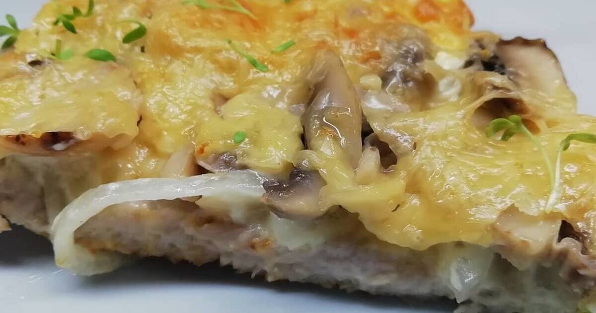Для приготовления я беру около 600 грамм свиной вырезки, нарезаю ее ломтиками толщиной примерно 1 см, отбиваю, солю и перчу. Грибы с луком обжариваю до золотистого цвета — это придает блюду насыщенный вкус и аромат. Затем выкладываю мясо на противень, сверху раскладываю грибы и заливаю все сметанно-яичным соусом с тертым сыром. Запекаю при 180 градусах около 25-30 минут до красивой золотистой корочки.