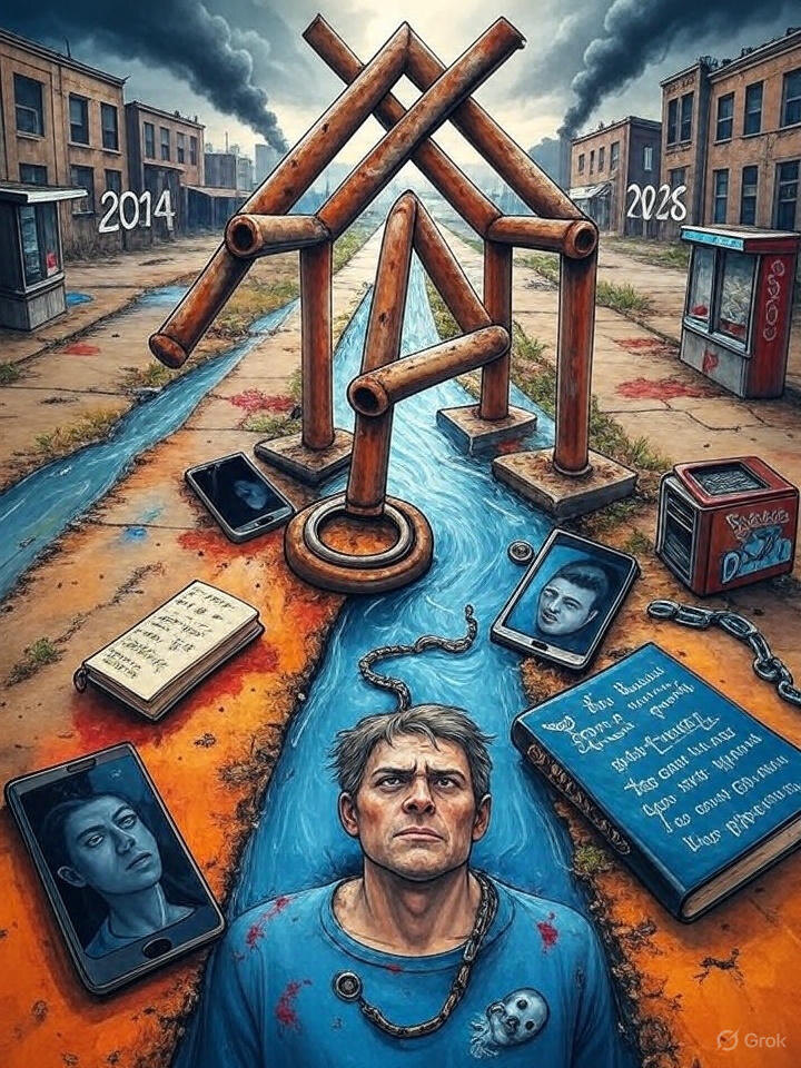 Бар на краю города пах пивом, потом и дешевым табаком, как заброшенные квартиры, где молодежь уехала в поисках работы, оставив только старую мебель и запах тоски. За окном — горы, окутанные дымом, пахнущим гарью, как после Лукавого, чья тень мелькала в толпе, без лица, но с глазами, которые знали всё. Алексей искал его, но теперь подозревал, что Лукавый — это он сам, или тень, которую он оставил на войне, когда указал на отряд, чтобы спасти себя. В углу сидел Коля, не пьяный, а странно спокойный, будто другой человек. Его «Лада» снаружи была зеленой, хотя вчера была алой. Он знал правду, но молчал, как молчат горы. Они пили, стаканы звенели, как кости в пустом доме. Алексей смотрел на Колю, видел в нем парня, что стоял рядом в горах, когда пуля выбрала друга. Или он сам выбрал? «Скажи, кто был тогда?» — спросил он, голос — как река, готовый утащить. Коля усмехнулся, но глаза его были чужими, как у старика. «Ты — это только то, что помнят другие, Леха. А если никто не помнит — ты Лукавый?» Алексей ударил кулаком по столу, стаканы задрожали, пена пролилась, как кровь. Он встал, чтобы уйти, но заметил шрам на своей руке, который пульсировал, как живой, и кольцо на шее сжалось, как петля. Бармен посмотрел на него, как на мертвеца, и отошел, бормоча: «Ты что, с мобилизации сбежал?» «Я найду», — сказал Алексей, но слова упали, как камни в воду, не оставив следа. Он побежал из бара, но в витрине увидел свое отражение, а за спиной — Лукавого, без лица, только запах гари. Он обернулся, но там никого не было, только телефон завибрировал, экран глитчил, как треснувшее стекло: Ты уже нашел. Лукавый. 35.13.2026. Шаги звучали вразнобой, как далекий гудок поезда, которого здесь не было. Что есть предательство, если оно — это твой голос, который ты заглушил? Жизнь — это не борьба с пустотой, а попытка забыть, что ты сам — пустота. Если ты Лукавый, то кто тебя ищет? Он побежал от витрины, но тени указывали путь назад, к перекрестку.