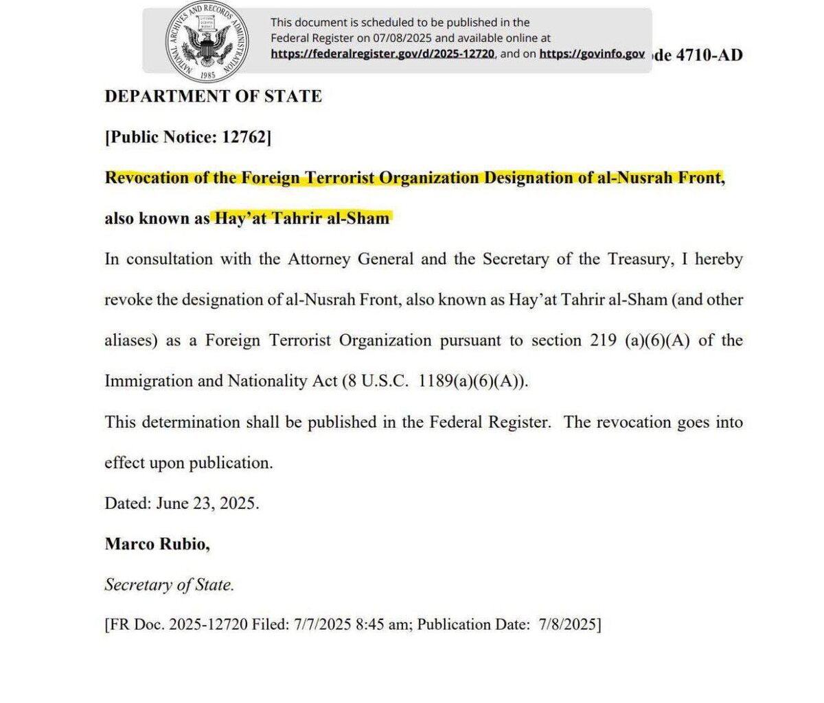 США исключили «Хайят Тахрир аш-Шам»* и сирийского президента Ахмада аш-Шараа из своего списка террористических организаций