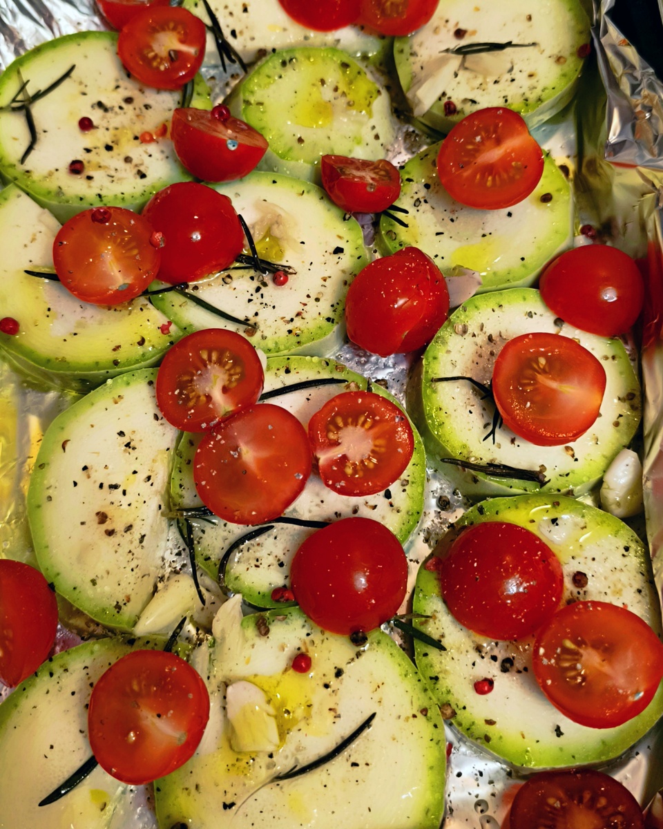 ИНГРЕДИЕНТЫ: кабачок, томаты черри, молодой чеснок, по веточке тимьяна и розмарина, оливыч, соль, перец.