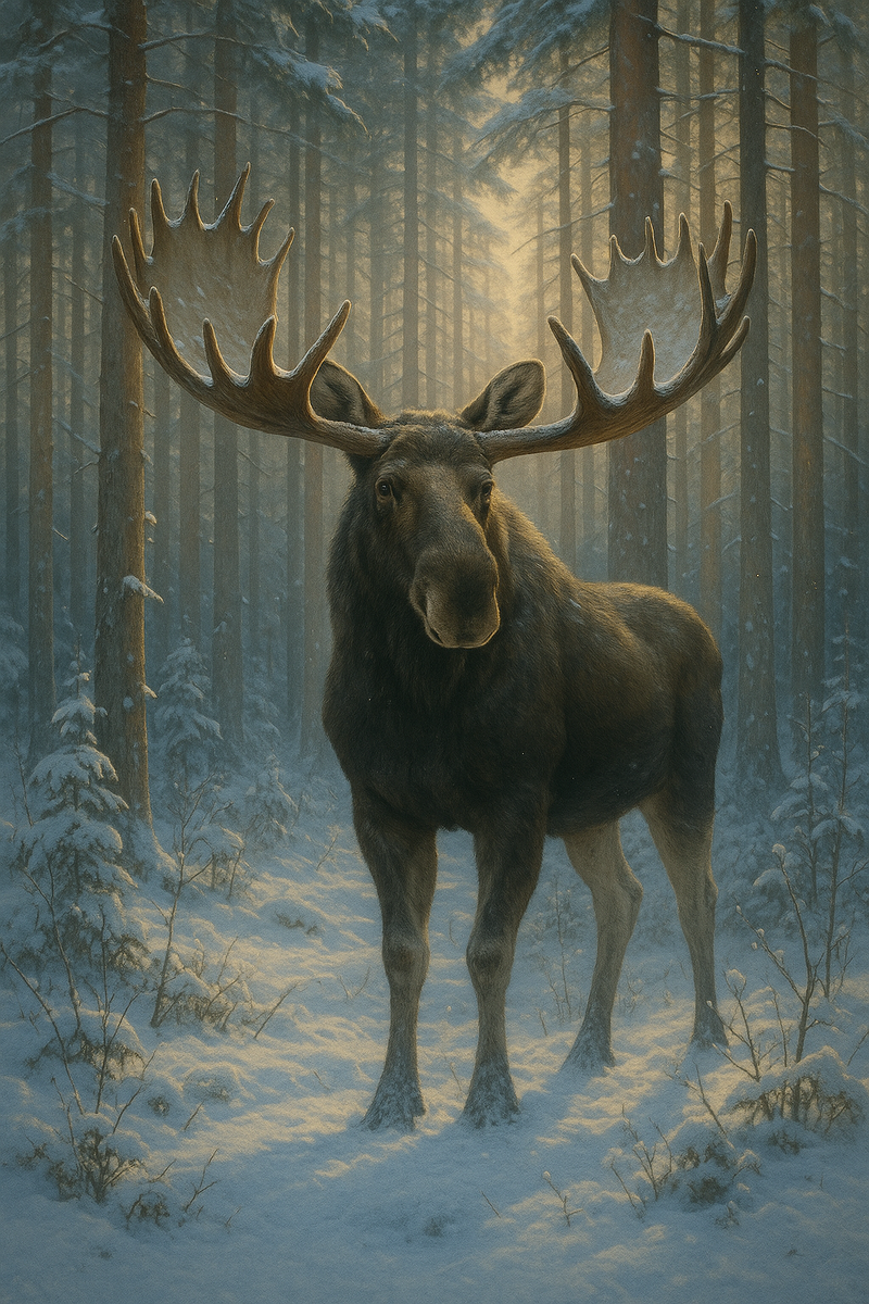• Лось — крупнейшее животное из семейства оленевых. • Высота в холке до 2,3 метра, вес — под 600–700 килограммов. • Рога — как корона: могут достигать 180 см в размахе. У самок рогов нет. • Ноги длинные, как у лошади. Благодаря им он легко идёт по снегу, болотам и чащам. Лось почти не издаёт звуков. Но у него чуткий слух и зоркий глаз. Он чувствует движение задолго до того, как ты его заметишь. Обычно — одиночка. Лишь осенью сближается с самками на период гона. И если ты услышал хрюканье в лесу — это, возможно, не кабан, а ревущий лось. Каждый год — новые рога Рога лося — как живые ветви: • Каждую осень он сбрасывает их • Каждую весну отращивает заново Это может занимать всего 2–3 месяца, и рога вырастают заново — массой до 30 кг. Лось спокойно преодолевает реки, может проплыть до 20 км. А если нужно — ныряет на глубину до 5 метров, чтобы достать водоросли. Вода — его стихия. Даже зимой. Его не пугает зима Толстый мех, жир и спокойствие делают его выносливым. Лось живёт там, где