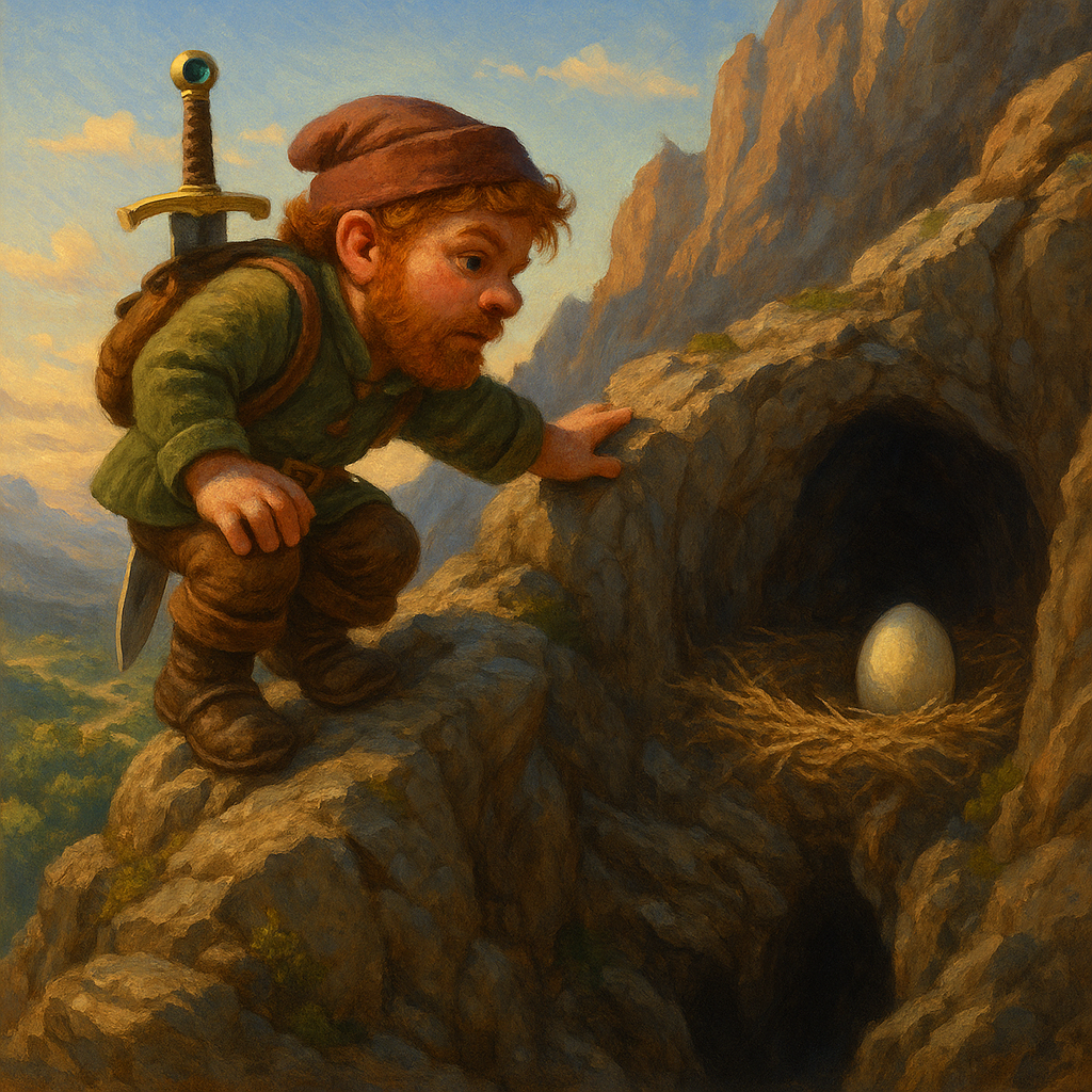 Пещера пряталась среди нагромождения скал, на вид совершенно непроходимых. Но не для гнома! Вили с лёгкостью взобрался по крутому склону и заглянул в остро пахнущее логово. Дракона не было, зато в глубине пещеры принц разглядел сложенное из торфа гнездо с тремя яйцами.