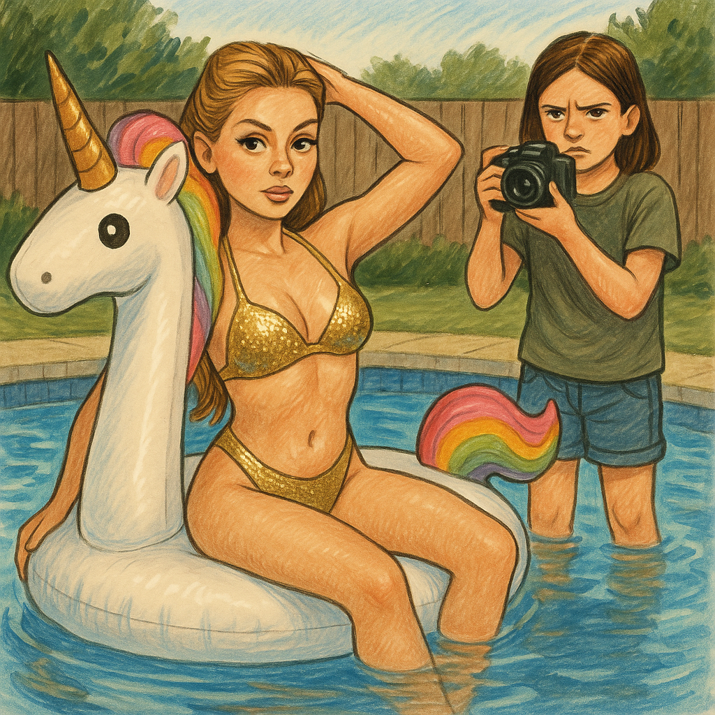 Весь день она провела у бассейна тёти на другом конце города, позируя в бикини, пока её десятилетняя сестра Энди угрюмо фотографировала её.