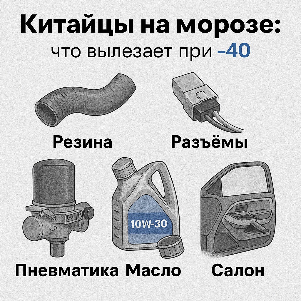 🧊 Китайцы на морозе: что вылезает при -40 Зима показала, кто где сэкономил. На китайских грузовиках с виду всё нормально — заводятся, греются. А в деталях начинаются нюансы. 📍 Вот что чаще всего подводит: Резина. Патрубки на охлаждение — как стекло, лопаются от давления. Меняй на армированные заранее. Разъёмы. Пластик дубеет, контакт теряется. Подогрев зеркал, фары — живут своей жизнью. Пневматика. Ресиверы без осушителя — лёд внутри. Клапана щёлкают, но не дуют. Масло. Если не сменил на нормальное зимнее — утром стартер крутит с мольбами. Салон. Защёлки ломаются просто от взгляда. Даже крышка пепельницы не выдержала. 🧰 Вывод один: китайца к зиме нужно готовить как старого друга — утеплять, смазывать, проверять всё руками. И тогда мороз не страшен. #ЗапчастиЯкутск #ЗапчастиДляГрузовиков #Truck #Truck14 #Зима #КитайцыНаМорозе 📲 Утепление и проверенные расходники — WhatsApp +7 (924) 466-10-10 🌐 truck14.ru