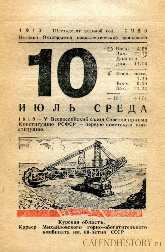 Итак, сегодня 10-го июля и у нас на календаре 1985-й год. Перед нами листок советского календаря для женщин. На календаре у нас среда - 10 июля 1985-го года. 1918 — V Всероссийский съезд Советов принял Конституцию РСФСР — первую советскую конституцию. Курская область. Карьер Михайловского горно-обогатительного комбината им. 60-летия СССР *** Оборотную сторону листка этого календаря можно посмотреть у нас по ссылке на сайте. Другие листки советских календарей смотрите у нас на сайте - CALENDHISTORY.ru ПОСМОТРИТЕ ЕЩЁ ЛИСТКИ ОТРЫВНЫХ КАЛЕНДАРЕЙ: