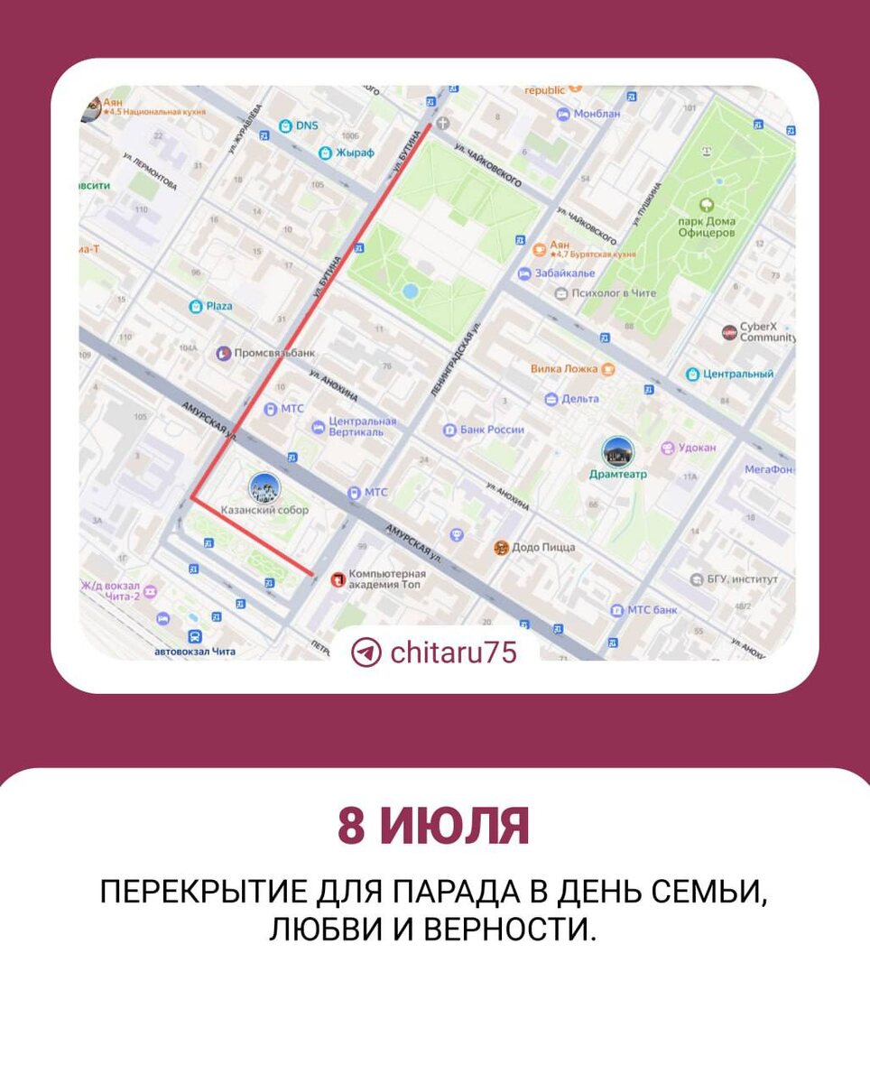 Сегодня в Чите перекроют дороги. 🟦С 15:00 до 20:00 закроют Соборный проезд для построения участников колонны. 🟦С 19:00 до 20:00 перекроют улицу Бутина от Собороного проезда до улицы Чайковского. В администрации города предупредили, что на площадь Ленина и в колонну семей нельзя будет проносить пиротехнику и спиртное. Программа праздника и парада семей — здесь. 🟦 Подписаться | Предложить новость
