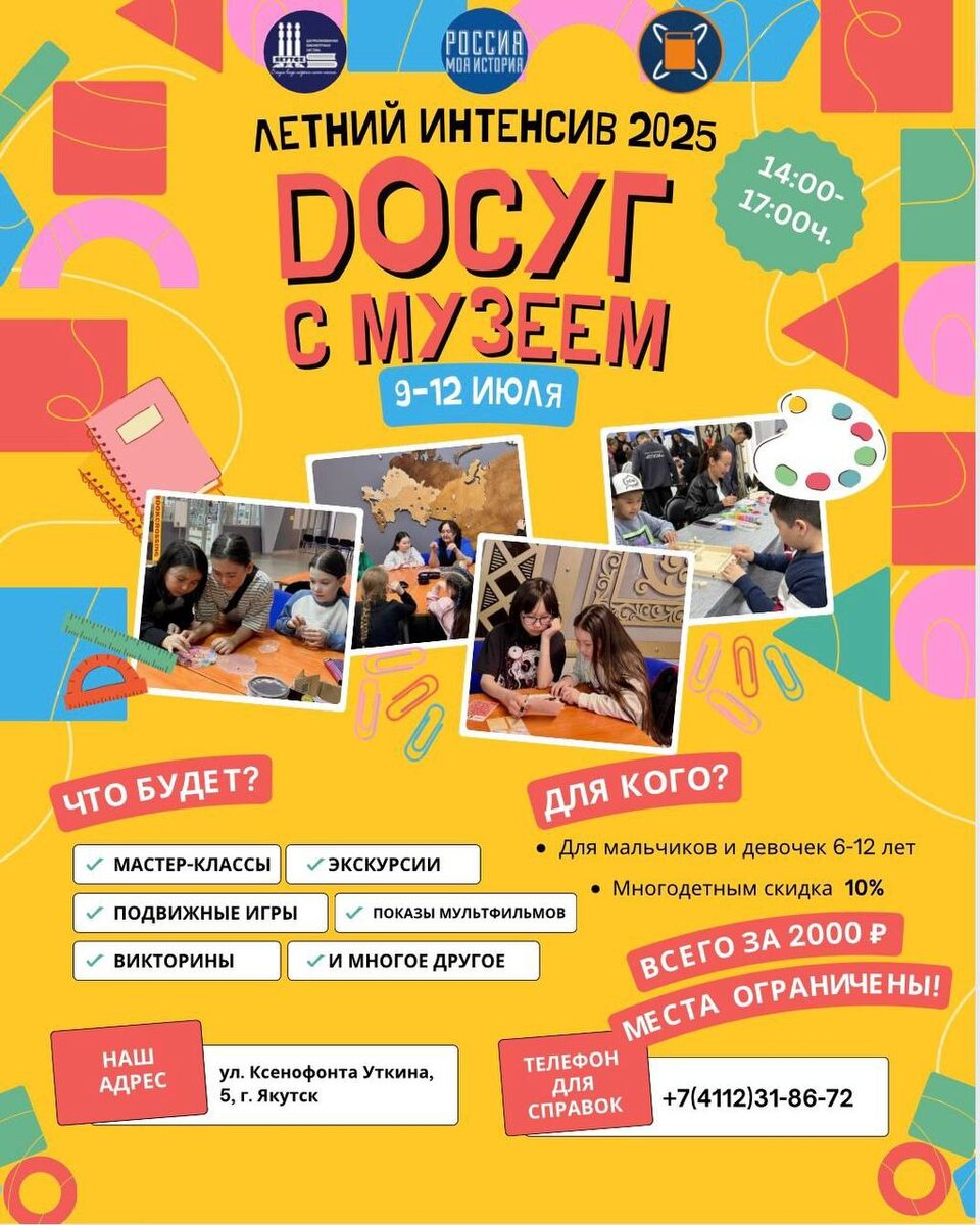 Досуг с музеем #МК #Детям Исторический парк «Россия - Моя история» совместно с библиотекой «Мир приключений» и с проектом «Наука начинается с нас» открывает Досуг с музеем. Мы объединили мощь исторического парка, волшебство библиотеки и креатив проекта, чтобы создать для вас настоящий праздник! В программе: 🤩 Захватывающие экскурсии 🤩 Увлекательные викторины 🤩 Показы мультиков 🤩 Крутые мастер-классы! 🤩 Подвижные игры на свежем воздухе! 🤩 Настольные игры А ещё: 🤩 знакомства с новыми друзьями! 🤩 веселое времяпровождение каждый день! 🤩 море положительных эмоций 9-12 июля | 14:00-17:00 Уткина, 5 2000 руб. +79669143768 Запись Online Якутия | Подписаться