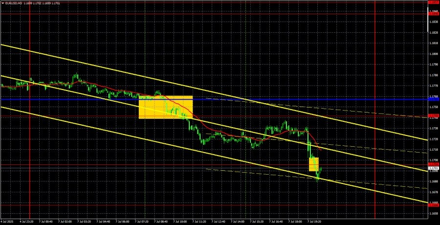 https://basechop.ru/wordpress/?p=49705 Анализ EUR/USD 5M. Валютная пара EUR/USD в течение понедельника торговалась с понижением, хотя для укрепления американской валюты не было объективно никаких причин. Однако рост доллара получился не сильным, что особенно хорошо видно на часовом ТФ. Напомним, что в рамках последнего витка роста пара выросла почти на 400 пунктов, а скорректировалась за последнюю неделю на 120. И это при том, что на прошлой неделе сильной макроэкономической статистики в США было достаточно много. Таким образом, у рынка имелись основания для продаж пары, но никто сейчас не хочет иметь дело с американской валютой. В понедельник макроэкономический фон в США отсутствовал, а в Евросоюзе он был очень слабым. Два европейских отчета, скорее, указывали на новый рост евро, но никакого влияния эти данные на настроение трейдеров не оказали. Промышленное производство в Германии выросло на 1,2% в мае при прогнозах 0%, но вместе с тем значение предыдущего месяца было пересмотрено