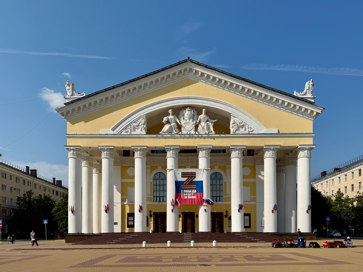 Расположился он на ступеньках Калужского областного драматического театра (ищите его у крайней левой колонны фасада Драмтеатра).