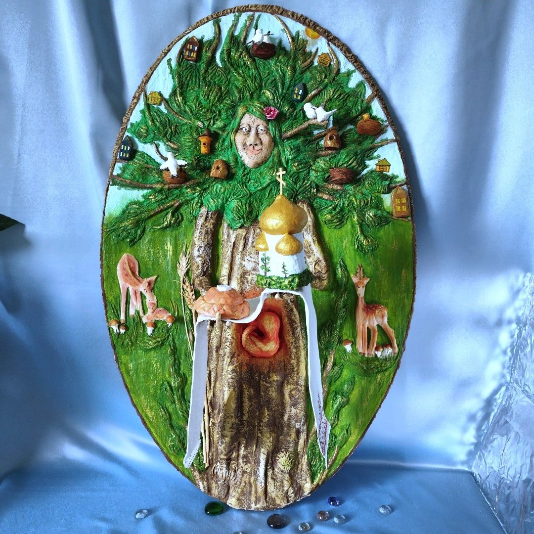 Вот моя конкурсная работа, панно 80х50 и полностью сделано из ваты. Называется «Дерево жизни». Тут и продолжение жизни, и любовь к природе и белый рушник – символ чистоты и хлеб всему голова и связь с духовным. Как вам моя идея? Только честно