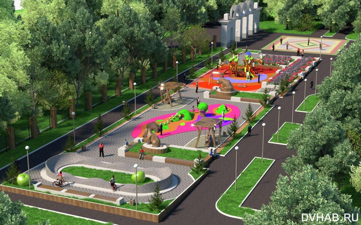 Реконструкцию детской площадки в парке мэрия задумала еще в прошлом году, тогда же прошли слушания по поводу того, что хотят видеть жители Хабаровска на этой территории. Вариантов было много - от повторения концепции площади Блюхера до установки турников и батутов. В итоге сейчас, когда администрация опубликовала закупку на проведение работ, проект претерпел значительные изменения. Изначально горожанам показывали такую картинку, отсылающую к природным элементам, материалам и текстурам: Но итоговое оформление площадки выглядит иначе и вдохновлено морскими мотивами. Центром этой территории станет городок в виде корабля. - Игровой комплекс в форме корабля по проекту состоит из 17 опорных столбов, игровой платформы, разделенной на три отсека, а также мачты с декоративными парусами и флажком. На платформу корабля можно подняться по канатной сетке, канатному трапу и пандусу, спуск возможен по горке. На стенах отсека будут установлены две интерактивные панели и штурвал. На опорных столбах зак