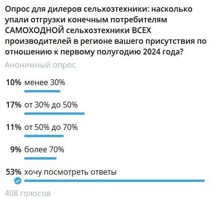 Большинство участников опроса для дилеров сельхозтехники отметили 30-50% сокращение отгрузки самоходной техники всех брендов потребителю – подводим итоги опроса, опубликованного в Telegram-канале АСХОД. Для чистоты результата мы, как всегда, исключили последний пункт опроса и приняли за 100% всех остальных ответивших. Всего сокращение отгрузок на 30-50% наблюдают 70 участников опроса (36,45%). В то же время 45 респондентов (23,4%) отметили снижение отгрузок от 50 до 70%. Немалый процент дилеров столкнулся с менее серьезным кризисом – 41 респондент (21,3%) отметил, что отгрузки упали менее, чем на 30%. Однако 36 участников (18,75%) опроса указали, что их отгрузки самоходной техники упали более, чем на 70%. ПроТрактор | Сельхозтехника