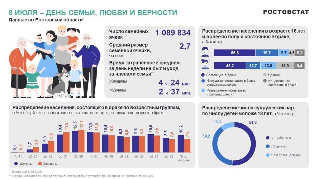 Более 15 лет подряд 8 июля в России отмечается День семьи, любви и верности — праздник, подчёркивающий важность семейных ценностей и традиций для каждого гражданина нашей страны. Именно семья становится основой общественного благополучия, хранит нравственные устои и воспитывает новые поколения. Согласно данным последней Всероссийской переписи населения, проведённой в 2021 году, подавляющее число жителей Ростовской области состоят в законном браке: 56,8% мужчин и 48,2% женщин. В донском регионе насчитывается свыше 1 млн семей, среди которых распространены разные типы семейного устройства: супруги с детьми, пары без детей, мать или отец с детьми. Среднестатистическая семья состоит из 2-3 человек. Наиболее распространенной является супружеская пара с детьми – 37,2% от общего количества семей. Большинство из них (89,8%) воспитывают одного-двух детей в возрасте до 18 лет. Жизнь каждой семьи ежедневно насыщена трудовыми буднями и заботой друг о друге. Женщины региона затрачивают на быт и ухо