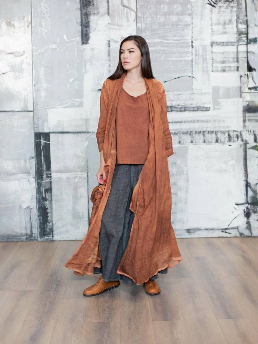 Авангардный образ от бренда LA VACA LOCA — идеальное воплощение современной эстетики и авторского стиля. В основе комплекта — платье-накидка на запах из премиального 100% рами, выполненное в технике сложного окрашивания, создающей глубокий и неоднородный терракотовый оттенок. Натуральная, дышащая ткань мягко драпируется, подчёркивая динамику кроя. Пояс на талии позволяет варьировать посадку, создавая как расслабленный, так и более структурированный силуэт. В качестве базового слоя — свободный хлопковый топ в тон платью, создающий гармоничную цветовую основу и добавляющий лёгкость. Образ дополняют широкие брюки в графитовом цвете, также прошедшие сложное авторское окрашивание. Изделие выполнено из 100% рами — легкой и пластичной ткани, которая эффектно движется и позволяет коже дышать.