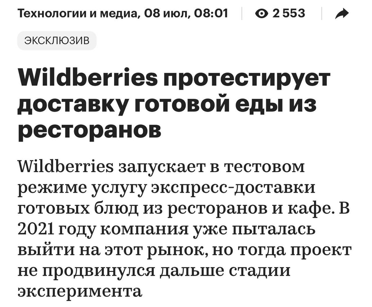 🛒 WB снова выходит на рынок доставки еды В тесте будут возить все меню сервиса доставки еды «Dostaевский» в Москве, Питере, Краснодаре, Сочи, Новосибирске, Ярославле, Тюмени и Уфе. Еще один огромный рынок, на который вышел WB за этот год. Писал про это тут 👉 https://dzen.ru/media/alantsoff/-vot-grafik-igry-v-rynki-685994440013fc52fe8337c3