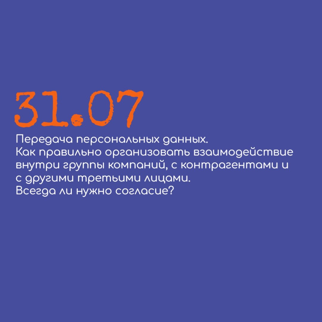 📣 Передача персональных данных. Как правильно организовать взаимодействие внутри группы компаний, с контрагентами и другими третьими лицами. Всегда ли нужно согласие? 📅Дата: 31 июля 2025 г. 🕒Время: 14:00 – 18:00 (местное время) 👩Эксперт: Шалагинова Елена Германовна (г. Москва) юрист-практик с опытом работы 7 лет, эксперт по правовой защите персональных данных, специалист по информационной безопасности холдинга, автор научных статей и публикаций в КонсультантПлюс, соавтор историко-правового комментария к Уставу Московской области. Вы — руководитель, юрист, контрагент или клиент? Вам приходиться осуществлять передачу персональных данных коллегам, партнерам и другим третьим лицам? На вебинаре расскажем, как это делать правильно, чтобы избежать ответственности за нарушение законодательства о защите персональных данных. 🔍 На вебинаре разберём: • Когда действительно нужно получать согласие на передачу ПДн? • Какие механизмы предусмотрены в законе №152-ФЗ? • Как минимизировать риски