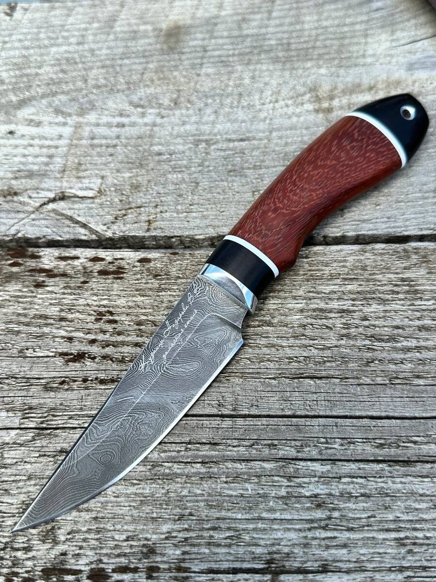Маленький, но удобный нож «Лань» из дамасской стали в 950 слоев. Спуски от середины клинка, что делает нож более прочным при боковых нагрузках. Рукоять у каждого ножа выполнена из черного граба и падука. Ножи заточены в бритву. Твердость клинка (HRC): 62 Цена ножа: 8.732 рублей. В комплекте идут ножны из натуральной кожи. Можем сделать формованные ножны +6000 рублей. Для заказа писать на @Nazarklinokbot или по тел +79101343831 WhatsApp/Viber