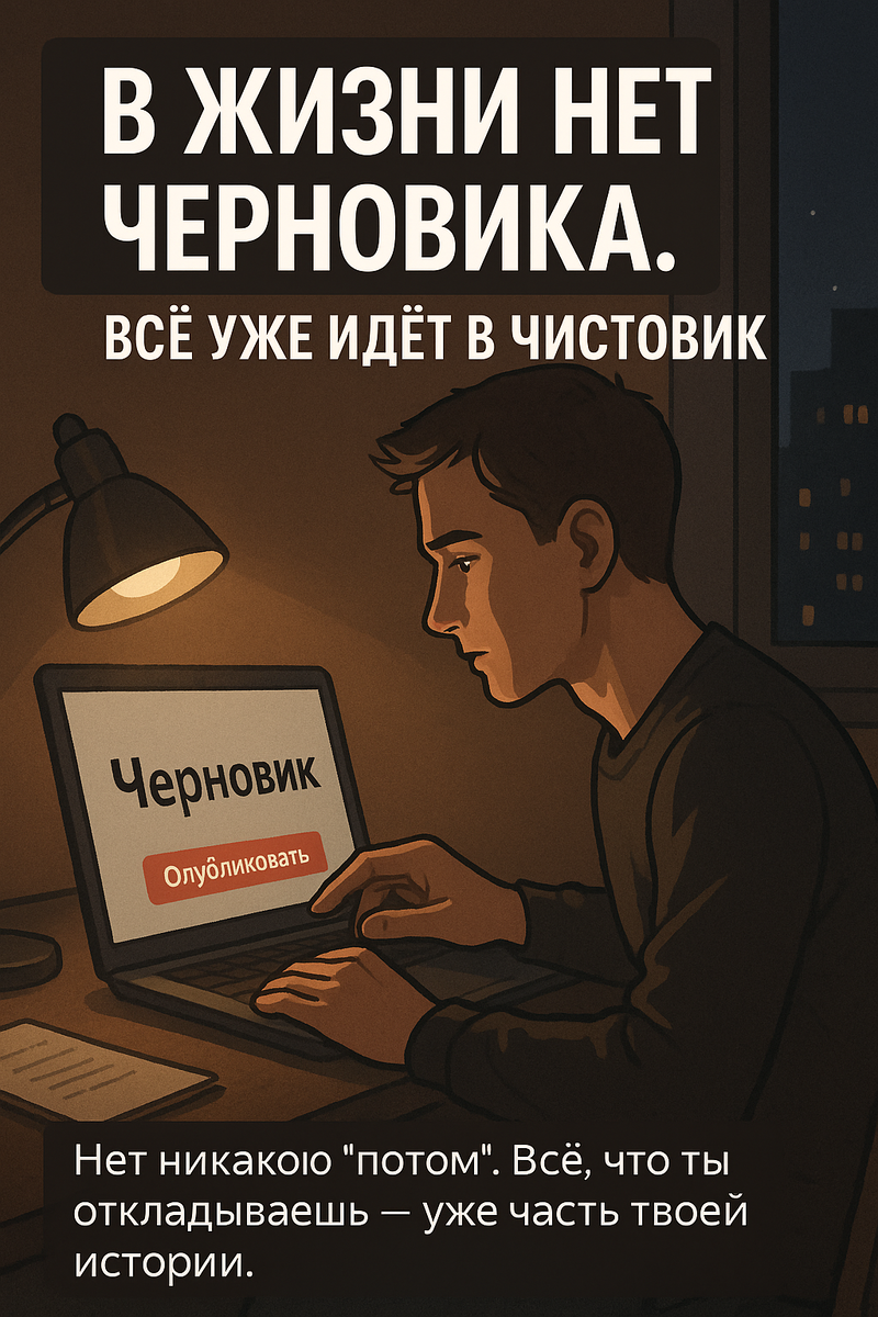 ✏️ Вы когда-нибудь ловили себя на мысли: «Ещё не время»? Не сегодня. Не в таком настроении. Надо подумать. Подготовиться. Кажется, что вы просто откладываете. На самом деле — вы живёте. И всё, что вы не сделали — уже стало частью истории. ❗ Почему «попозже» — самая опасная иллюзия Мы думаем, что жизнь на паузе. Что ещё не началось по-настоящему. Но на самом деле: 📌 Жизнь не спросит: «Ты готов?» Она идёт. И каждый день — не черновик, а финальная сцена. 🧠 Почему так хочется откладывать 💥 Черновик — это иллюзия безопасности. Но там нет жизни. 📎 История: письмо, которое не ушло Мужчина хотел извиниться перед отцом. Долго. Он писал и стирал. «Не те слова», «не тот момент». Отец умер. Он читал это письмо над гробом. Вслух. Слишком поздно. 📌 Гораздо лучше сказать неидеально, чем не сказать вовсе. ✅ Как выйти из режима «черновика» 1. Назовите вслух то, что откладываете. Не прячьте за «рано». Назовите: разговор, решение, шаг. 2. Представьте, что сегодня —