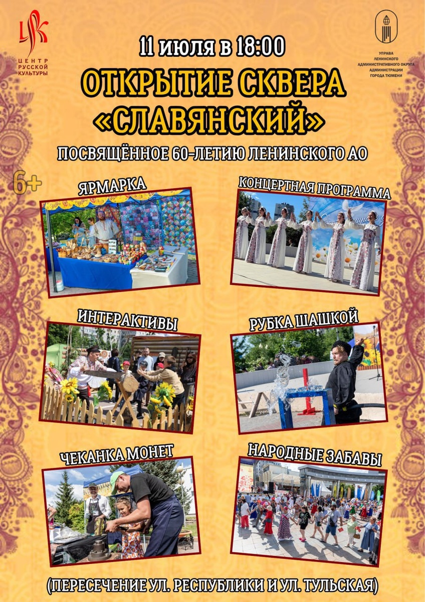 В этом году Ленинскому округу исполнится 60 лет: в Славянском сквере намечается стилизованный праздник 11 июля в 18 часов в обновленном Славянском сквере (ул. Республики – ул. Тульская – ул. Рижская) состоится праздник, посвященный открытию территории. Это одно из событий, посвященное юбилею округа. Работа в сквере проводилась в два этапа: были уложены новые тротуары, газон, высажены деревья, установлено наружное освещение, а также скамейки, урны, качели. В июне, после проведения пусконаладочных работ, зажурчал «ручей». Территория полностью готова к встрече гостей. В пятницу горожан пригласят на чеканку юбилейной монеты «60 лет ЛАО», на чаепитие с баранками, посоревноваться в поднятии гирь, а также освоить «рубку шашкой». Посетить такие площадки, как «Русское подворье», «Казачья удаль», «Русский богатырь», «Музей кузнечного мастерства» и торговые ряды ремесленных мастерских можно будет до 20-00. Подробнее