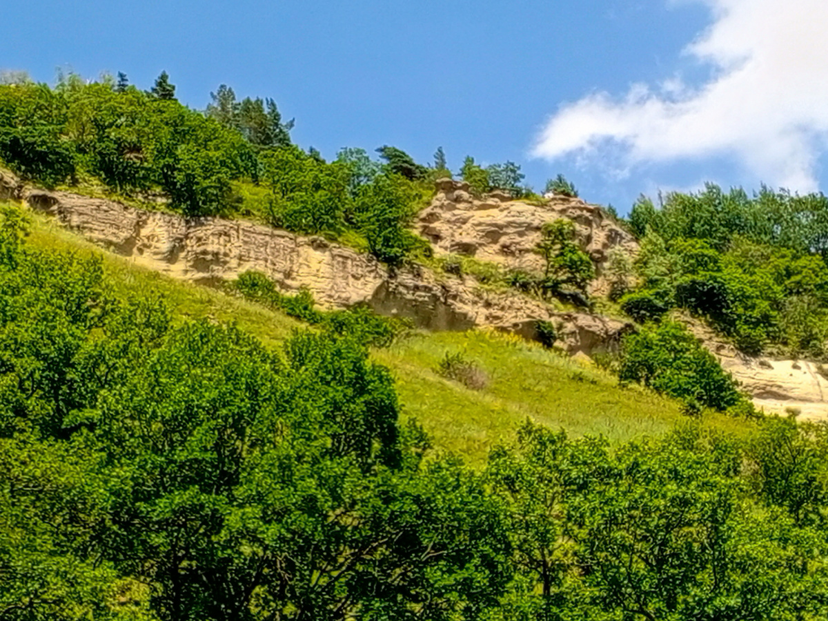 Дорога ведёт почти один километр, от указателя и она асфальтированная, так что можно укрыться в тени под деревьями — сегодня жарко, 28 градусов, а ощущается как все 30.