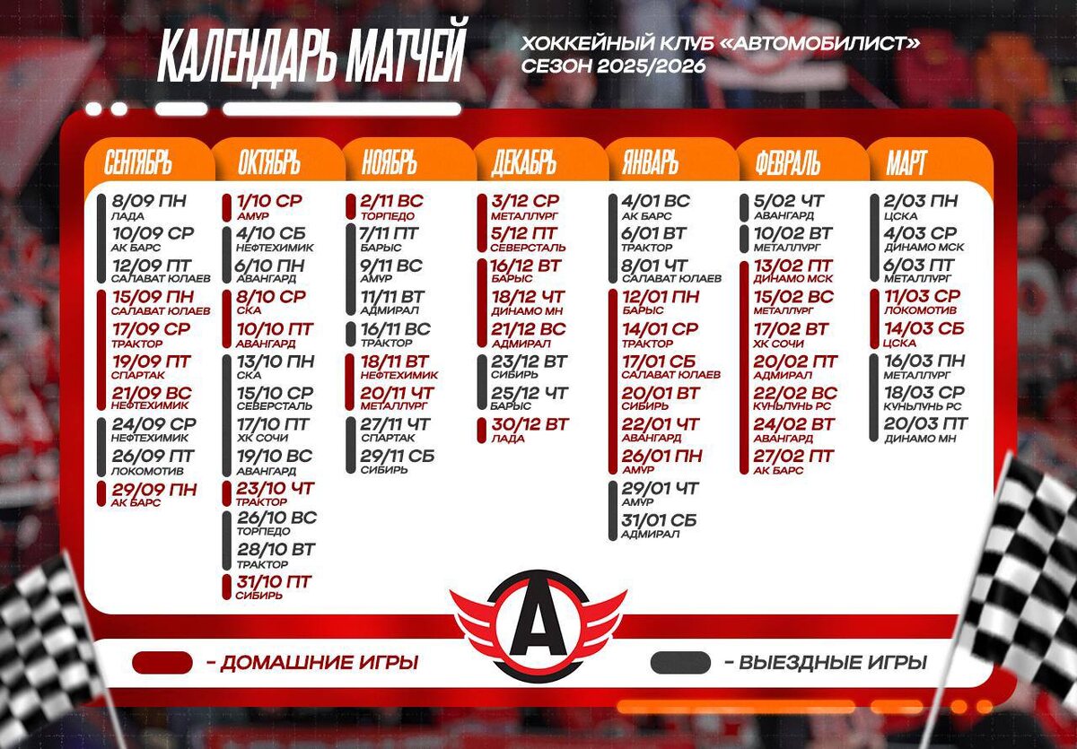 Екатеринбургский «Автомобилист» обнародовал календарь матчей на сезон 2025/26.