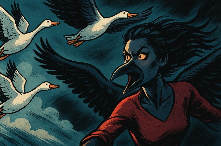 Собралась стая гусей на зимовку, на юг. К ним ворона: — Ребята, я с вами. — Ворона, мы птицы перелетные, привычные. А ты ведь не долетишь — далеко же! — Не! Я птица большая, я птица сильная, я долечу. Первый перелет — тренировочный, один день. Гуси прилетают на место, ворона за ними приземляется — уставшая, язык на плечо. — Ворона, оставайся! Ты уже надрываешься! — Не! Я птица большая, я птица сильная, я долечу. Второй перелет — до моря, три дня. Гуси долетают нормально, ворона приземляется через шесть часов полумëртвая. — Ворона, ну, куда ты полетишь? Оставайся, пока жива. Следующий перелет над морем, потонешь ведь... — Я птица большая, я птица сильная, я долечу... Третий перелет над морем — семь дней. В первый же день ворона безнадежно отстаëт. В срок гуси приземляются за морем. Вороны, понятное дело, нет. Подождали ее пару дней, помянули бедняжку добрым словом, только собрались лететь на место, видят: над горизонтом точка. Ворона. Летит буквой «зю», вслепую, не разбирая ни дороги, н