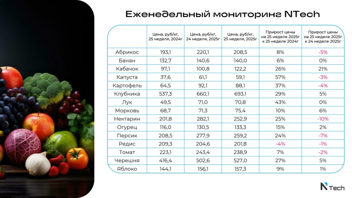 Клубника и черешня в этом году почти на треть дороже, чем в предыдущем. Исследовательская компания NTech опубликовала усредненные данные по России, касающиеся цен на ягоды, фрукты и овощи в 2024 и 2025 году. Любопытны в этом свете, конечно, не актуальные ценники, а годовая разница. Сколько же добавили в цене популярные товары? Рекордсмен – капуста. Средняя стоимость килограмма год назад – 37,6 руб, сейчас – 61,1 руб. Разница – 57%. Второе место – лук, он подорожал на 43%. И на третьем месте картофель – плюс 37% год к году. Что касается сезонных «вкусняшек». Черешня 2024 год – 416 рублей/кило 2025 год – 502 рубля/кило Разница: 27% Клубника 2024 год – 537 рублей/кило 2025 год – 660 рублей/кило Разница: 29% Абрикосы 2024 год –193 рубля/кило 2025 год – 220 рублей/кило Разница: 8% Ну а дешевле за год стал только редис. В 2024 году его отпускали по 209 рублей за килограмм, а теперь он продается по 204 рубля. Аркадий Водкин