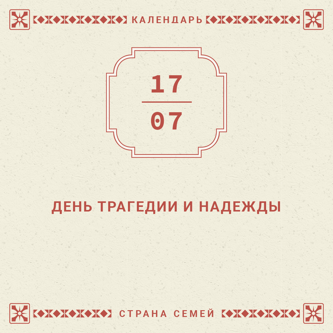 Этот день — трагическая дата нашей истории. В этот день в 1918 году на Урале был совершён зверский расстрел семейства Николая и Александры Романовых со всеми их пятью детьми. Было совершено убийство, ставшее прообразом страдания российской семьи на протяжении последующего столетия. В страшном подвале в Екатеринбурге были расстреляны не просто царствующие особы, но была расстреляна СЕМЬЯ. Была нарочито и символически уничтожена семья как таковая. И это событие можно считать предзнаменованием и началом всех тех бедствий, которые претерпел институт семьи в 20-м веке не только в России, но и по всему миру, и тех нестроений, которые продолжают терзать его до сих пор. Этот день — дань памяти царственным страстотерпцам, претерпевшим от идеологических врагов семьи за каждую российскую семью. Ужасающий расстрел царской семьи в начале XX веках остаётся для нас мерой всех страданий российской семьи в XX–XXI веках. Но помня об этой ТРАГЕДИИ мы не теряем НАДЕЖДУ. И не желая подчиняться семьененавис