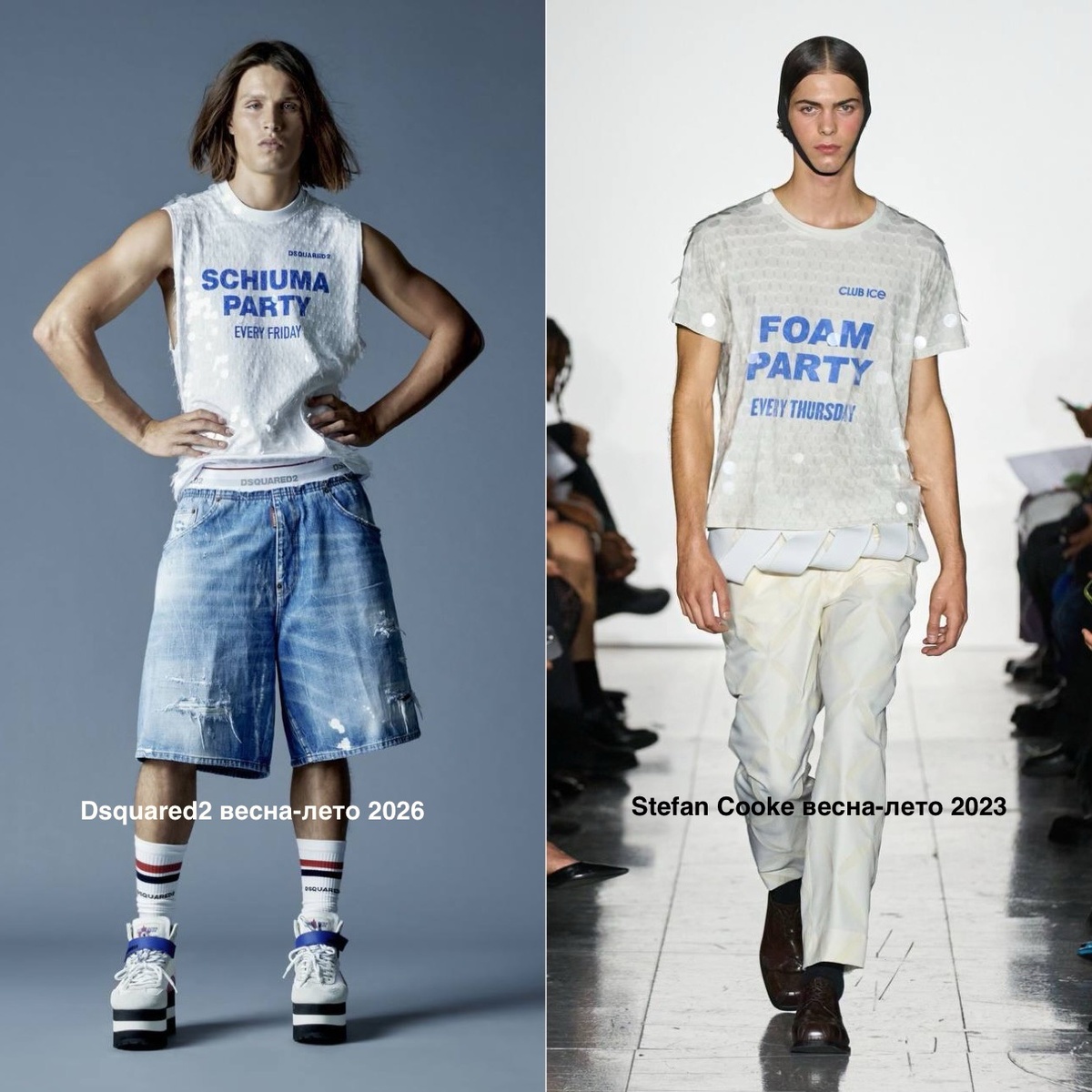В мире высокой моды разразился громкий скандал, затрагивающий вопросы авторских прав и этики в дизайнерском сообществе. В центре внимания – обвинение в плагиате, выдвинутое брендом Stefan Cooke в адрес Dsquared2. Речь идет о футболке из коллекции Stefan Cooke весна-лето 2023 года, которая, по мнению дизайнеров первого бренда, практически дословно скопирована в коллекции Dsquared2 весна-лето 2026 года. Конкретно, спор разгорелся вокруг футболки Stefan Cooke с надписью "FOAM PARTY. Every Thursday". В коллекции Dsquared2 появилась аналогичная футболка, но с надписью "SCHIUMA PARTY. Every Friday". Разница, конечно, есть: итальянское "SCHIUMA" - это "пена", синоним английского "FOAM", а смена дня недели - незначительная деталь. Но суть надписей идентичен! Однако, главное сходство кроется даже не в тексте, а в визуальном исполнении. Футболки практически идентичны по фактуре ткани: обе выполнены из материала с крупными прозрачными пайетками, создающими определенную текстуру и блеск. Это схо