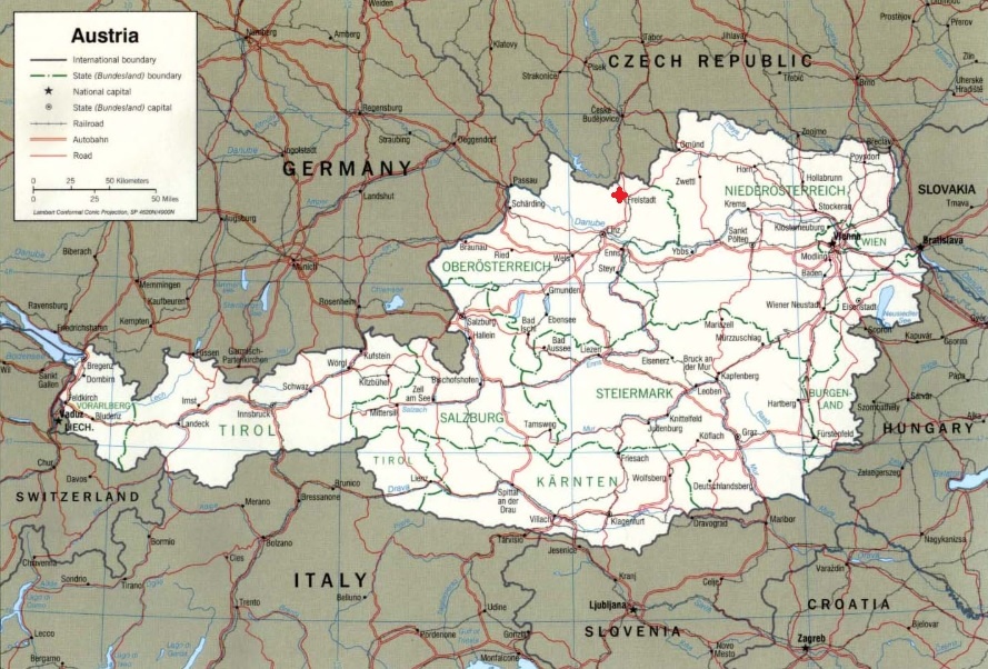 Добравшись до железнодорожной станции, я нашла карту местных транспортных путей и расписание поездов на стене здания вокзала. В окошке билетной кассы задумчиво что-то читала кассир, а в зале ожидания было довольно пусто. Я воспользовалась моментом и стала пристально изучать висевшую на стене карту. Наш городок, отмеченный на карте красной звездочкой, назывался Freistadt и находился на самой границе с Чехией.