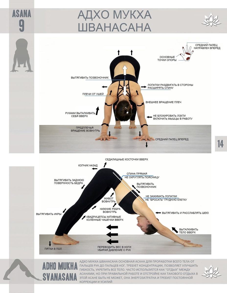 Собака мордой вниз (Адхо Мукха Шванасана) — одна из самых узнаваемых асан в йоге и, возможно, первое, что приходит на ум при слове «йога». Но за простым внешним видом скрывается сложная и полезная работа для всего тела. Эта поза встречается почти в каждом комплексе: от силовых виньяс до мягких растяжек. Кто-то использует её как переход, кто-то — как полноценную статическую практику. Адхо Мукха Шванасана — настоящая «перезагрузка» для тела. Она сочетает в себе вытяжение и силу, активность и покой. Вот что даёт регулярная практика: 🔹 Мягко вытягивает позвоночник, помогает разгрузить спину после сидения и напряжения