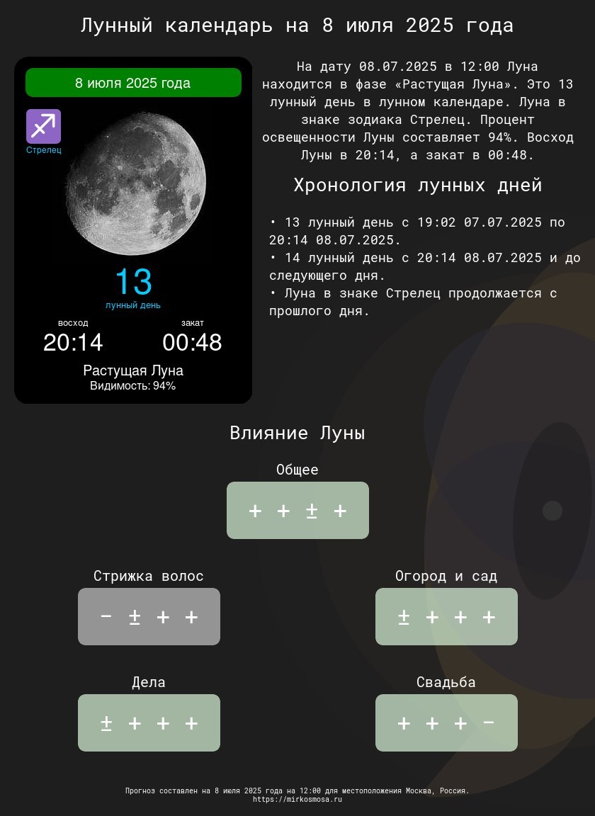 Лунные календари на 8 июля 2025 года: Подготовьтесь к этому дню с учетом влияния Луны! 🔹🌗 Лунный календарь на 8 июля 2025 года — Что приготовила Луна? Подробнее 🔹✂️ Лунный календарь стрижек на 8 июля 2025 года — Подходящий ли день для обновления прически? Подробнее 🔹🌱 Лунный календарь огородника и садовода на 8 июля 2025 года — Лучшее время для ухода за растениями. Подробнее 🔹📅 Лунный календарь дел на 8 июля 2025 года — Удачные моменты для важных задач. Подробнее 🔹💍 Лунный календарь свадеб на 8 июля 2025 года — Подходит ли этот день для вашего торжества? Подробнее