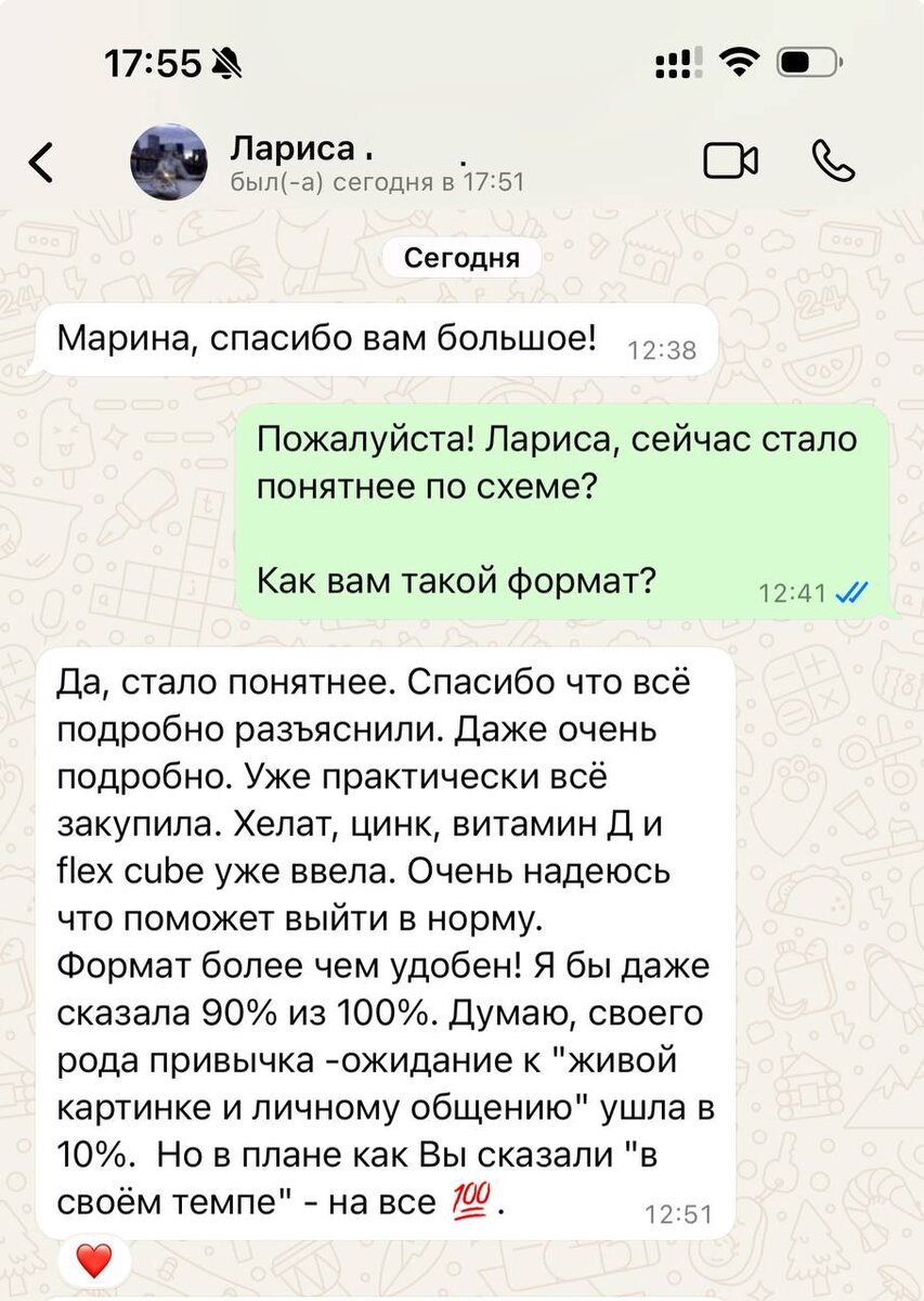 Опробовала новый формат консультации: формат текстового и голосового чата. Первый отзыв вы уже видите! А запрос был обьемный: Разобрали анализы, дозировки добавок и их сочетание + схему приема в течение дня Дала рекомендации по нутрмцевтикам для волос и объяснила, почему предыдущие попытки улучшить их состояние не давали результата Дала рекомендации по питанию в связи с не усвоением жиров, высыпанием в зоне декольте и объяснила, как сочетать добавки для суставов при имеющемся диагнозе хондромаляция надколенника 2 степени ✨ Новая услуга — экспресс-консультация по анализам и нутрицевтикам Если ты: – получила результаты анализов и не знаешь, что с ними делать – устала от врачей, которые говорят «всё в норме», но тебе нехорошо – хочешь понять, какие добавки тебе действительно нужны – хочешь поддержать себя грамотно, без догадок 📍 Я разберу твои анализы и подготовлю: ✅ голосовые рекомендации ✅ PDF с разбором и схемой нутрицевтиков на 1–2 месяца ✅ рекомендации по питанию ✅ и 7 дней обр