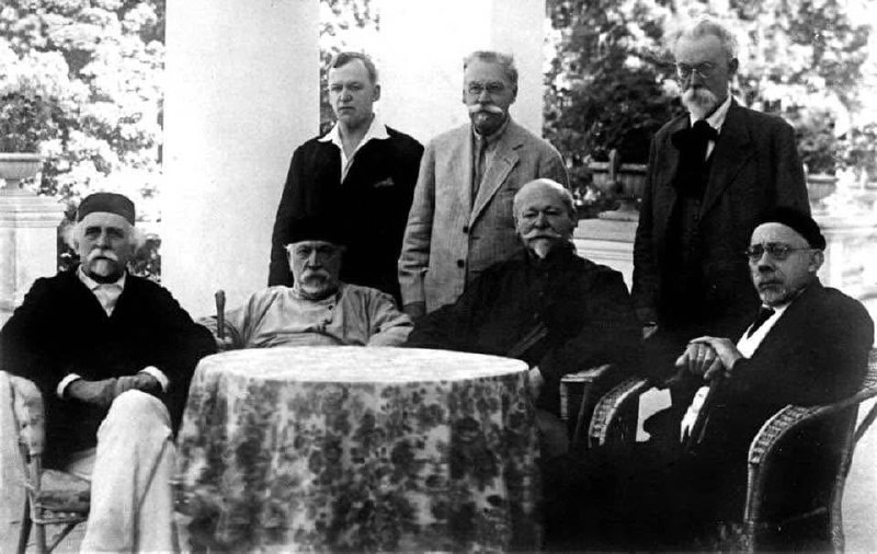 Сидят: Н. Д. Зелинский, И. А. Каблуков, Н. М. Кижнер, А. Н. Северцов;