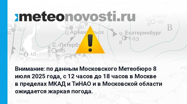 Внимание: по данным Московского Метеобюро 8 июля 2025 года, с 12 часов до 18 часов в Москве в пределах МКАД и ТиНАО и в Московской области ожидается жаркая погода. Перейти на сайт Прогноз погоды на 14 дней