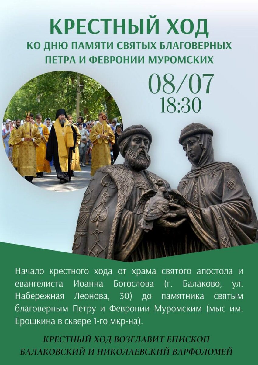 Духовенство, прихожане балаковских храмов и жители города пройдут крестным ходом от храма апостола и евангелиста Иоанна Богослова (набережная Леонова, 30) до памятника благоверным Петру и Февронии Муромским, который располагается на мысе Ерошкина в сквере 1-го микрорайона. Возглавит крестный ход епископ Балаковский и Николаевский Варфоломей.
