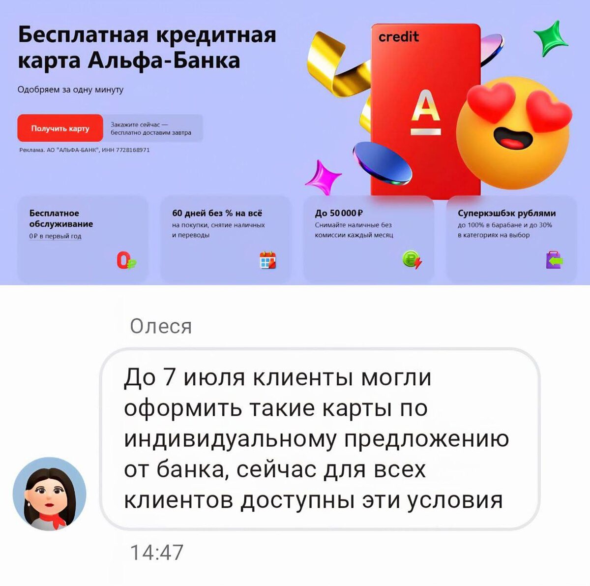 🅰️ Альфа с 7 июля выдает кредитки с льготным снятием наличных (50 тр/мес