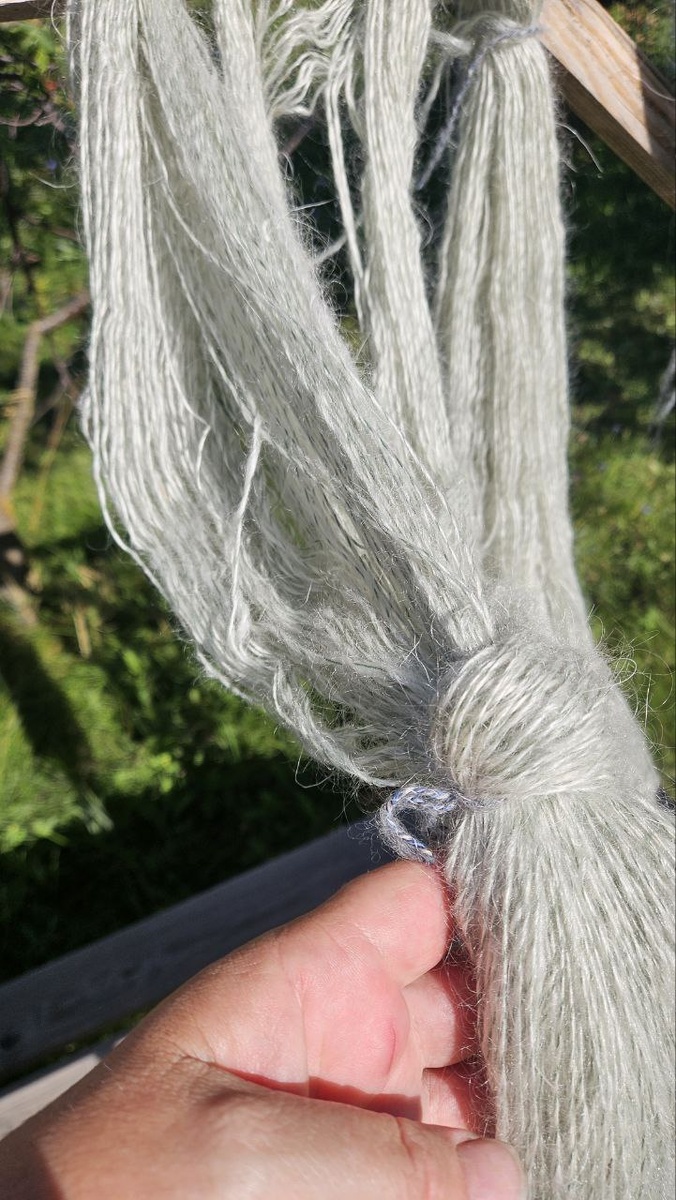 За ночь пряжа и джемпер не высохли. Досушиваю на солнце Кстати, если вы хотите избавиться от запаха, то налейте в воду чуть-чуть белизны. Даже если это серый пух Работает этот способ. А то бывает, стираешь-стираешь, а все-равно слабый запах меха остаётся. Запах хлорки убивает запах шкуры. Но только в том случае, если это не гулящий козел И 3 дня проветривания тоже убирает слабый запах козы