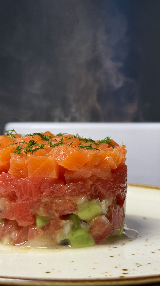 Приготовление Порежьте кубиком авокадо У помидора удалите мякоть и так же порежьте кубиком Красный салатный лук мелко пошинкуйте Смешайте в отдельном блюде посолите и добавьте сок лайма Немного оливкового масла и перемешайте Вырежьте мякоть у грейпфрута и порежьте кубиком Затем так же порежьте кубиком красную рыбу. Возьмите кулинарное кольцо и выкладываем салат. 1) Микс салата. 2) Грейпфрут. 3) Красная рыба. Сверху немного укропчика Это очень красивый салат , который передает такой букет вкусов , что он понравится вам с первого раза !