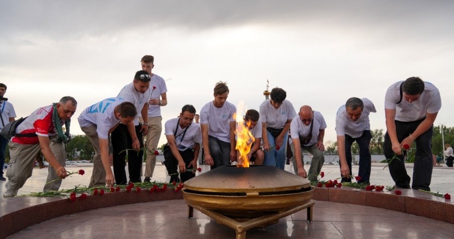 «Евразия жүрөгүнө саякат» катышуучулары Бишкектеги Өчпөс отко гүлчамбар коюшту
