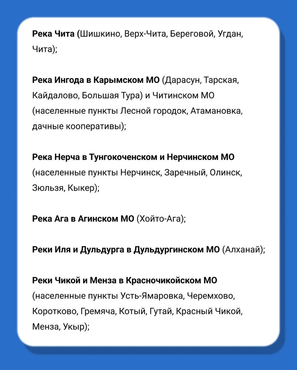⚡️МЧС Забайкалья перевели в режим повышенной готовности из-за угрозы паводков. По прогнозам синоптиков, с 8 по 10 июля в разных районах выпадет большое количество осадков, что может вызвать новую волну паводков и подтопления. По данным тг-канала краевого МЧС, местным властям даны рекомендации по действиям в экстренных ситуациях. На особом контроле — крупные реки и населённые пункты по всему региону⬇️ 📌📌📌📌📌 Новости Забайкалья