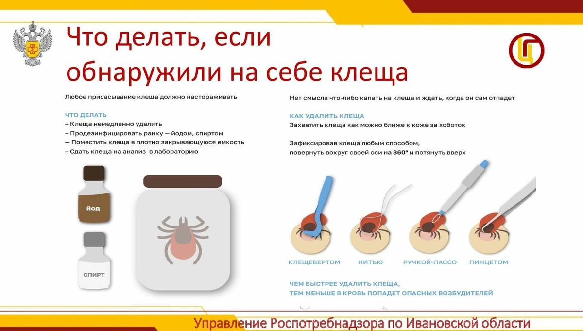 Клещи в Ивановской области кусают людей активнее, чем год назад На 7 июля в Ивановской области зарегистрировано 1.615 обращений жителей в медучреждения по поводу укусов клещей, сообщает Роспотребнадзор (на прошлой неделе их было 1.537, неделей ранее 1.440). Отметим, что в прошлом году 1364 обращения по поводу укусов клещей было зарегистрировано только к началу августа. При этом Роспотребнадзор указывал, что активность клещей в 2024 году снизилась почти вдвое — в 2023 году в Ивановской области к медикам по поводу присасывания клещей обратились более 3 тысяч человек. По результатам исследований возбудители клещевого энцефалита не выделялись. Из общего числа обследованных клещей в 21 % выделен возбудитель боррелиоза и 2 % обнаруживается возбудитель моноцитарного эрлихиоза. Фото: Управление Роспотребнадзора по Ивановской области