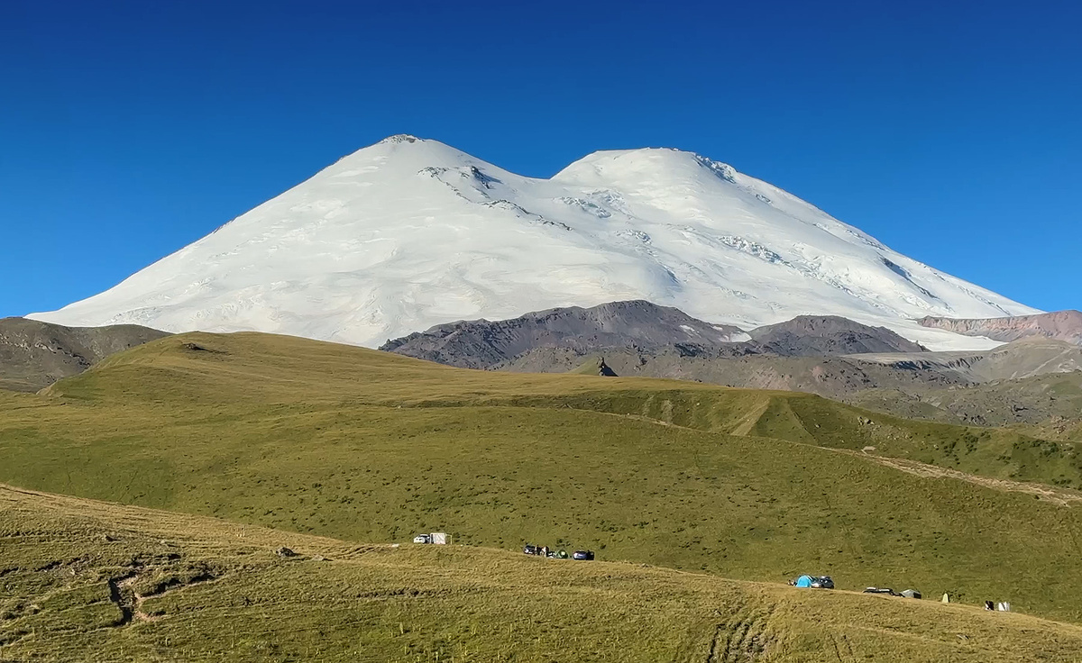 48-й день похода по Кавказской тропе. Утром Эльбрус предстал во всей красе. Огромная снежная вершина упирается в безоблачное синее небо. Самая высокая гора Кавказа и Европы возвышается передо мной. Этот гигант впечатляет и одновременно тревожит. Одно дело просто смотреть на него, но когда предстоит обойти его и подняться на высокий перевал на его плече, то волнения не скрыть.