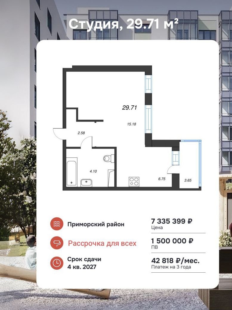 💳РАССРОЧКА НА 3 ГОДА В ПРИМОРСКОМ РАЙОНЕ • Рядом с комплексом расположены Суздальские озера и лесопарк • Увеличенные балконы • Панорамные виды • Ландшафтное озеленение • Коворкинги и соседский клуб • Три современных детских сада по 140 мест каждый • Школа на 825 мест Рассрочка на 3 года для всех: • Цена — 7 335 399 ₽ • Первый взнос — 1 500 000 ₽ • Ставка — 8% • Платеж на 3 года — 42 818 ₽/мес. • Остаток через 3 года, либо переход на ипотеку 🛫Буклет проекта, планировки с ценами, расчет рассрочки — отправим в личные сообщения, для этого поставьте ➕ в комментариях