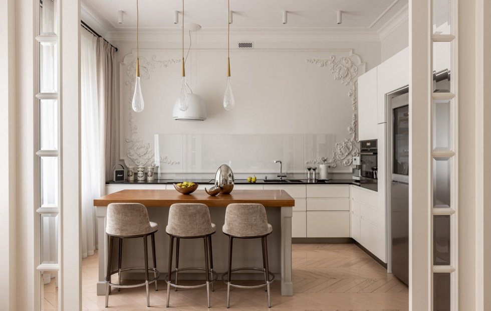 Не обязательно делать кухню стерильно-белой. Можно играть с оттенками: молочный, слоновая кость, светло-серый, нежно-бежевый. Главное — избегать контрастных сочетаний, которые дробят пространство на фрагменты.