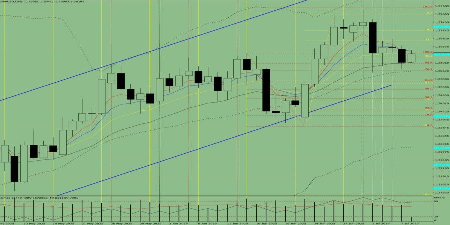 Альтернативный сценарий: цена от уровня 1.3597 (закрытие вчерашней дневной свечи), может начать движение вверх, с целью 1.3638 – 8 средняя ЕМА (синяя тонкая линия). При тестировании этой линии цена, возможно, начнёт движение вниз, с целью тестирования откатного уровня 61.8% – 1.3531 (красная пунктирная линия).