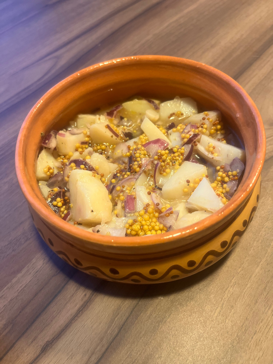 Сегодня решила приготовить что-то необычное — Венский картофельный салат в качестве гарнира к фальшивому зайцу (рецепт в прошлом посте). Честно говоря, само сочетание слов картофель и салат вызвало у меня сомнения, но разве не в этом суть экспериментов? Ингредиенты на 4 порции: • 500-600 г молодого картофеля • 1 красная луковица (можно заменить шалотом) • 100 мл овощного бульона • 3 ст.л. яблочного уксуса • 2 ч.л. дижонской горчицы • 4 ст.л. оливкового масла • 1 ч.л. сахара • Соль, перец по вкусу • Зелень для подачи Рецепт казался простым: отварной картофель, лук, уксус, бульон, немного масла и горчицы. Всё смешать, дать настояться — и можно подавать. Но на деле... Это было невкусно. То ли кисло, то ли сладко, то ли горько — непонятно. Возможно, я что-то сделала не так, но желания повторять совершенно нет. Дайте мне обычную отварную картошечку с душистым горчичным маслом и щепоткой соли! А если добавить кусочек селёдочки — это вообще песня. Просто, вкусно, б